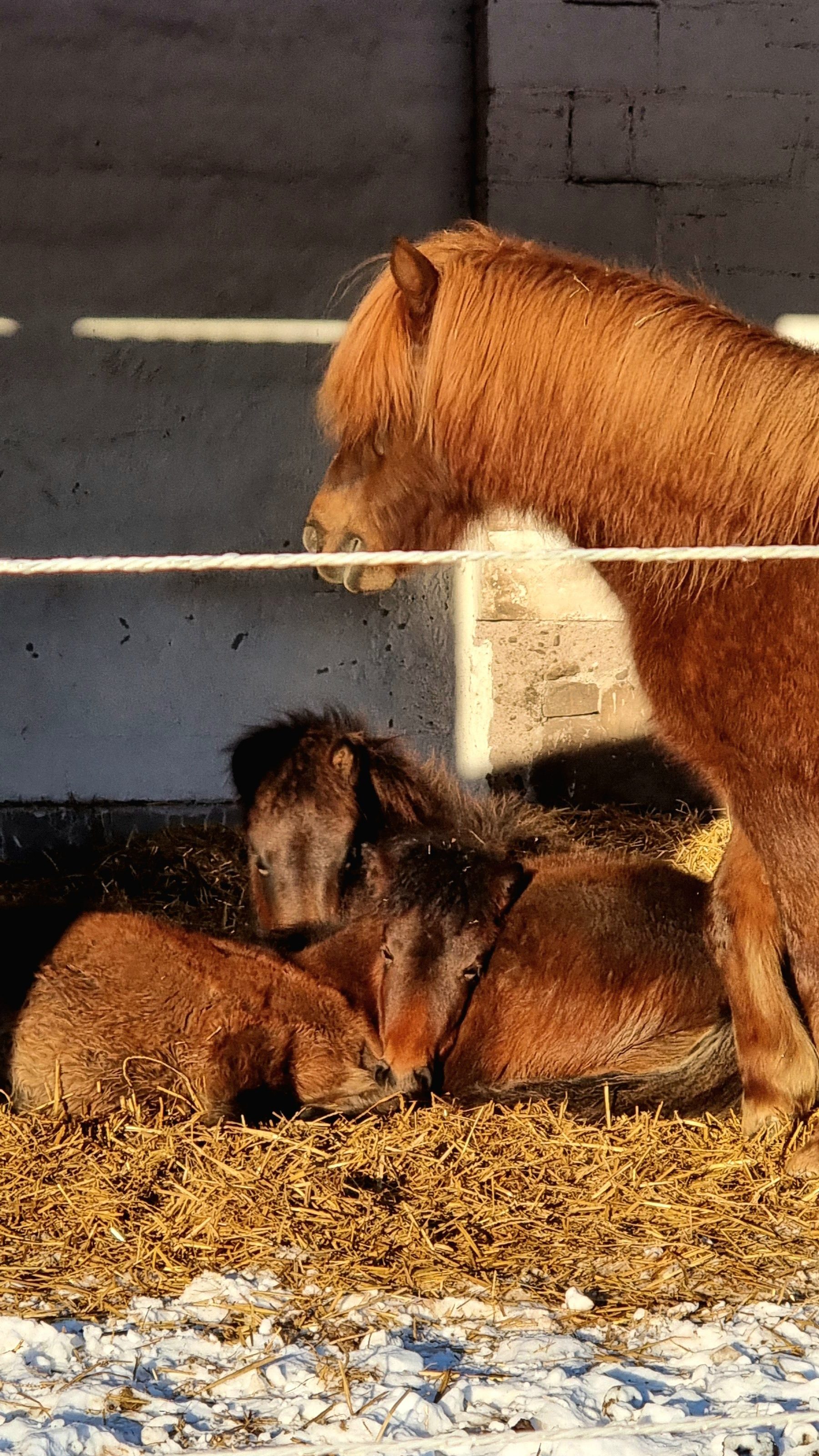 För avelsston och ungston samt ston som inte längre används som ridhästar erbjuder vi lösdrift med halmad ligghall, fri tillgång till grovfoder, saltsten samt uppvärmd vattenkoppor med flottör.